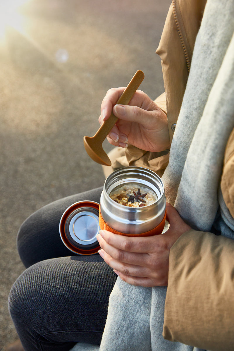 Kompaktní, moderní a minimalistický tvar. Objem, který pojme, je vhodný pro dospělé i děti. Broušenou nerezovou ocel doplňuje tkaný textilní popruh, který elegantně drží lžíci vyrobenou z přírodního dřevěného vlákna bezpečně u sebe. Tvar lžíce je inspirován japonskými naběračkami na polévku ramen (mokusei otama-jakushi). Díky dlouhé rukojeti snadno dosáhnete na dno nádoby, což vám zajistí lepší zážitek z jídla. Design cestovní nádoby na jídlo je jednoduchý, praktický a nadčasový z hlediska formy i funkce. Časem se na ní možná objeví nějaký ten škrábanec nebo promáčknutí, ale to jí jen přidá na charakteru a půvabu.