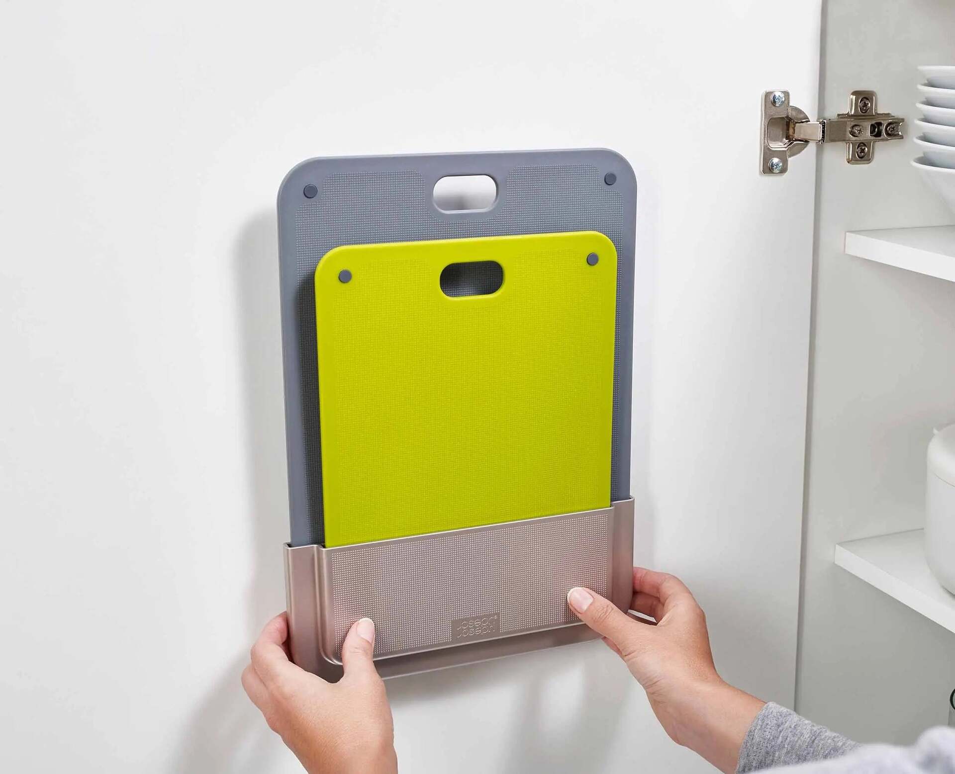 Don't have room for a cutting board on your worktop? Meet DoorStore, a cutting board set with a clever storage solution. The set includes two cutting boards as well as a flat storage case that you can easily attach to the inside of your kitchen door. cabinet (or on the wall), saving valuable space in the kitchen while keeping the cutting boards out of sight when not in use.