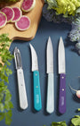 The Opinel Les Essentiels Art Déco set includes a carving knife, a serrated knife, a vegetable knife and a peeler. The carving knife is suitable for cleaning and slicing vegetables, fruit and smaller pieces of meat. The serrated knife is ideal for slicing soft fruit, vegetables and hard-boiled eggs. The vegetable knife has a rounded blade and a serrated edge. The peeler is suitable for both right-handed and left-handed people.