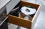 Už žiadne neprehľadné kuchynské skrinky, žiadne kompromisy v oblasti použiteľnosti alebo výkonu. Inovatívna skladacia rukoväť s patentovanou technológiou SwingLock™ bola starostlivo navrhnutá pre odolnosť a jednoduché skladovanie. Vďaka možnosti stohovania ušetríte až 50 % úložného priestoru v zásuvkách a kuchynských skriniach.
