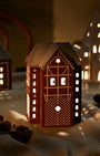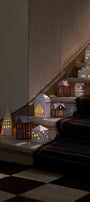 Vytvorte útulnú vianočnú scénériu tým, že okolo chalúpok rozmiestnite malých škriatkov, alebo chalúpky vystavte samostatne ako ručne vyrobené dizajnové doplnky. Lesklá a na dotyk príjemná glazúra v kombinácii s rustikálnou neglazovanou keramikou vyzerajú krásne a šíria množstvo vianočnej nálady. Dôležitým detailom je, že perníkové chalúpky sú zvnútra glazované bielou farbou, aby odrážali teplé svetlo čajových sviečok. Všetky okienka sú ručne vyrezávané, odlesk čajovej sviečky tak vytvára hravé zhluky svetla a tieňov, nech ich umiestnite kamkoľvek.