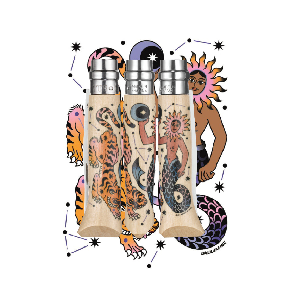 Kapesný nôž Cosmos Dalkhafine predstavuje stretnutie pozemskej sily a kozmickej energie: silný a majestátny tiger sa klania pred morskou pannou, ktorej hlava žiari ako slnko. Slnko predstavuje vládnucu hviezdu, ktorá bdie nad vesmírom, rovnako ako morská panna bdie nad mesiacom.