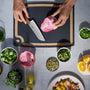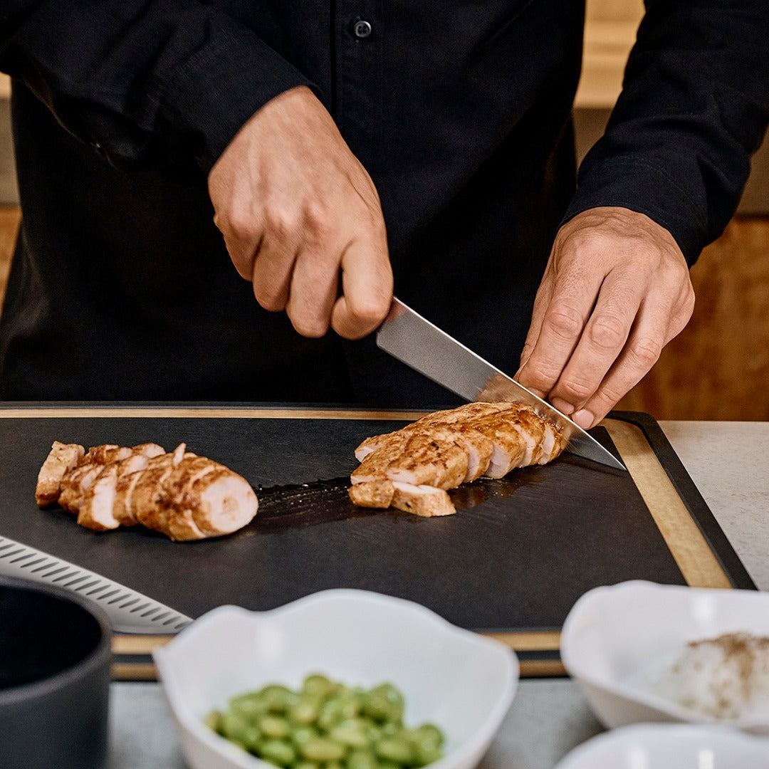 Spríjemnite si každodennú prácu v kuchyni s touto štýlovou doskou na krájanie z radu Victorinox Gourmet. Krájacia doska je vyrobená z papierového kompozitného materiálu, je elegantná a štíhla, ale zároveň veľmi odolná. Ponúka povrch šetrný k nožom a tepelnú odolnosť do 175 °C, takže ju môžete používať od krájania počas prípravy jedla až po servírovanie počas večere. Praktická drážka na zachytávanie šťavy udrží všetko čisté počas práce. Posuňte svoju prípravu a servírovanie na vyššiu úroveň.