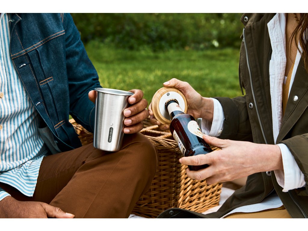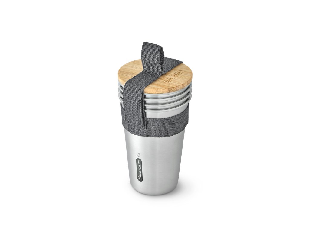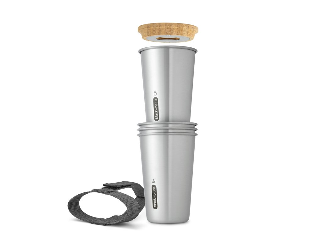 Súprava 4 ľahkých pohárov z nehrdzavejúcej ocele, ktoré možno umývať v umývačke riadu. Každá súprava je stohovateľná a dodáva sa s bambusovým viečkom so zabudovaným otváračom na fľaše, ktoré slúži ako doska na krájanie. Ideálne na krájanie limetiek alebo mäty do obľúbených nápojov na cestách. Pevný nylonový popruh drží všetko pohromade, vďaka čomu sa poháre ľahko prenášajú.