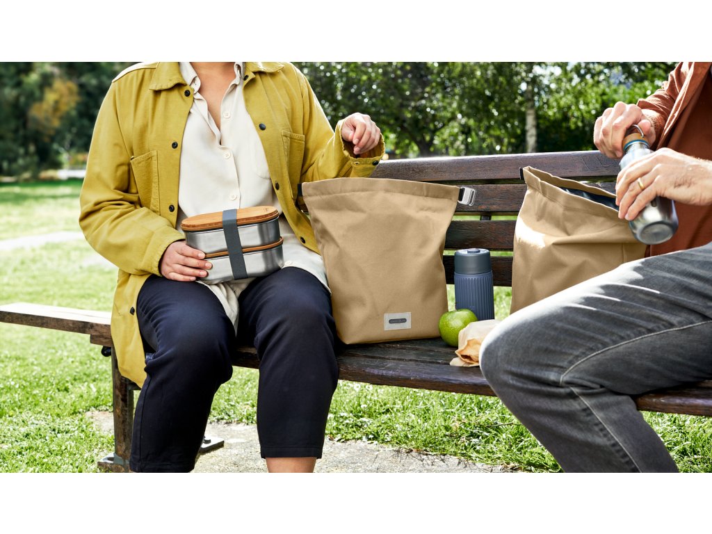 Izolovaná taška na oběd o objemu 6,7 l vyrobená z recyklovaného PET (např. plastových lahví). Je dostatečně velká na to, abyste v ní mohli nosit vše, co potřebujete na celý den, včetně krabičky na oběd, láhve s vodou, ovoce a svačiny.