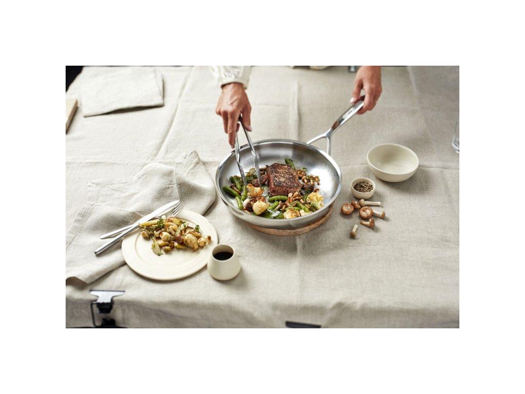 Panvica z radu Multiline belgického výrobcu Demeyere, ktorý je súčasťou nemeckej skupiny Zwilling. Tento vysokokvalitný riad z nehrdzavejúcej ocele 18/10 vám bude skvelým pomocníkom. Je vyrobená z exkluzívneho sedemvrstvového materiálu, vďaka ktorému sa teplo šíri veľmi rýchlo a rovnomerne. S touto robustnou a zároveň ľahkou panvicou, ktorá patrí k špičke v sortimente Demeyere, môžete variť ako šéfkuchár.