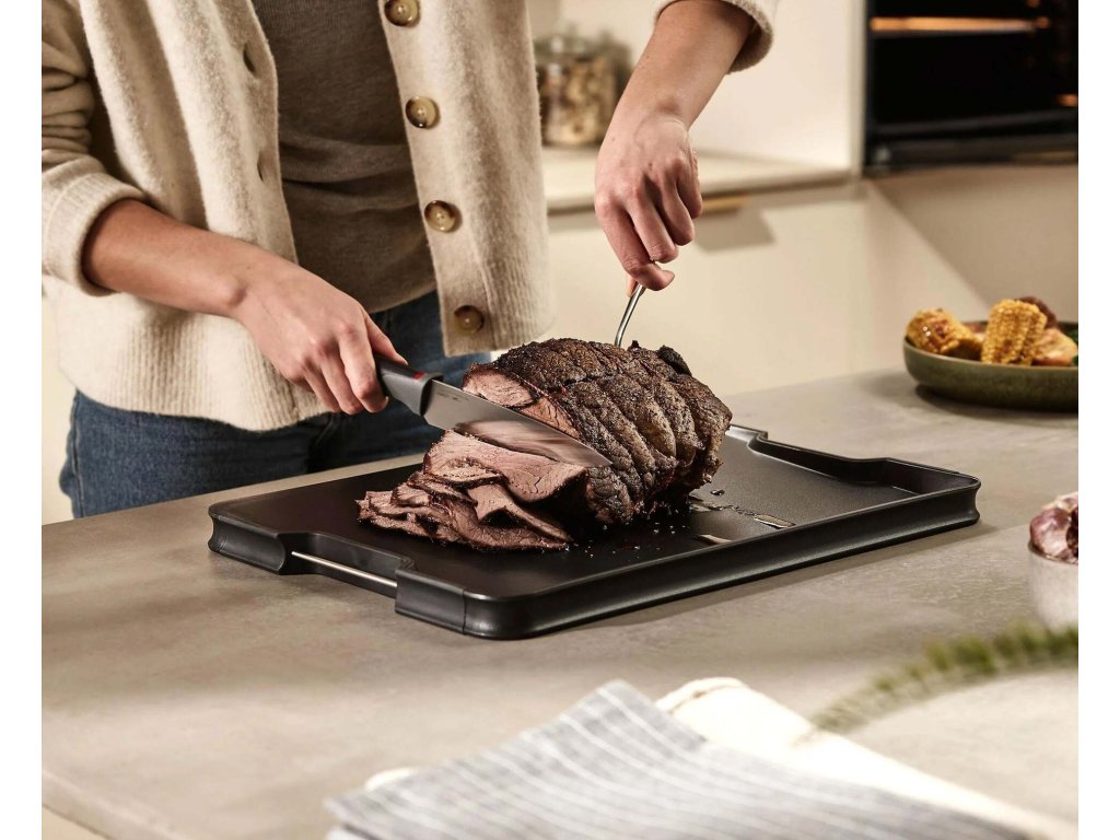 Doska na krájanie Cut&Carve Plus má rôzne možnosti použitia. Výčnelky v strede jednej strany dosky na krájanie pomáhajú držať mäso pri krájaní, tienia mäso a pomáhajúDruhá strana, ktorá je hladká, poskytuje krájaciu plochu na všetky ostatné druhy prípravy potravín. Medzi ďalšie premyslené detaily patrí šikmá základňa alebo vyvýšenévyvýšené okraje a rohy na ľahké vylievanie prebytočných tekutín. Ak je na jedálnom lístku nedeľná praženica, doska na krájanie Cut&Carve sa vám v kuchyni určite bude hodiť!