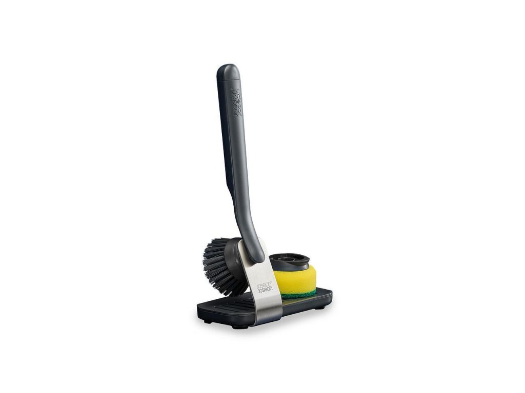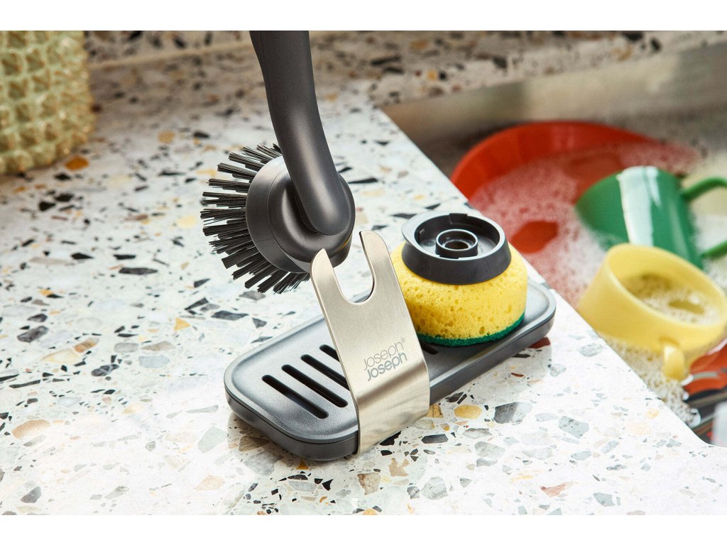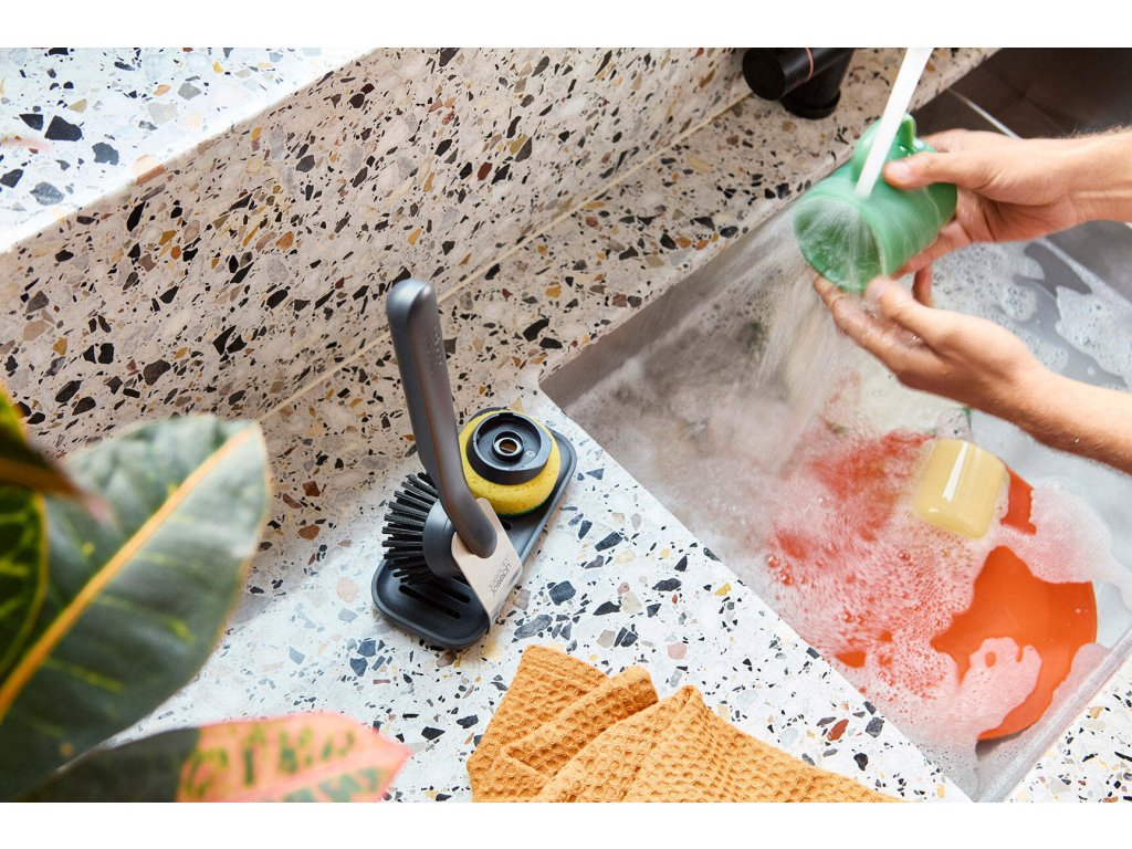 Kefka na riad SinkTech s odolnými štetinami na efektívne čistenie je vybavená integrovanou škrabkou, vďaka ktorej ľahko vyčistíte akýkoľvek riad. Súčasťou je stojan z nehrdzavejúcej ocele s odkvapkávacou miskou pre jednoduché skladovanie a rýchle schnutie a tiež náhradná hubková hlavica.