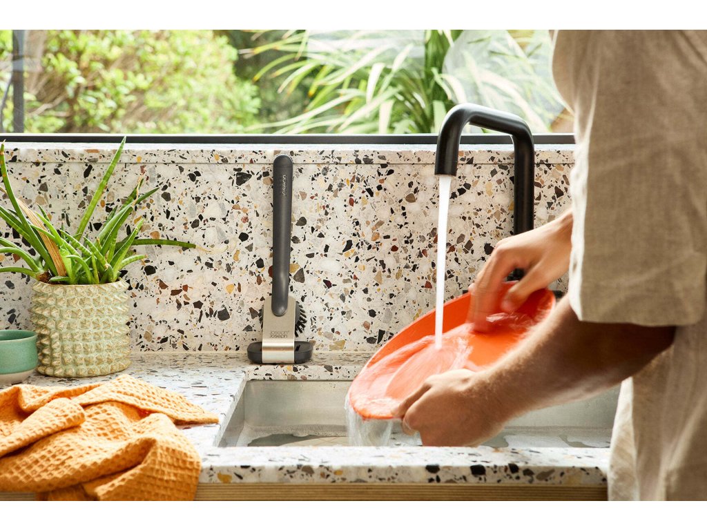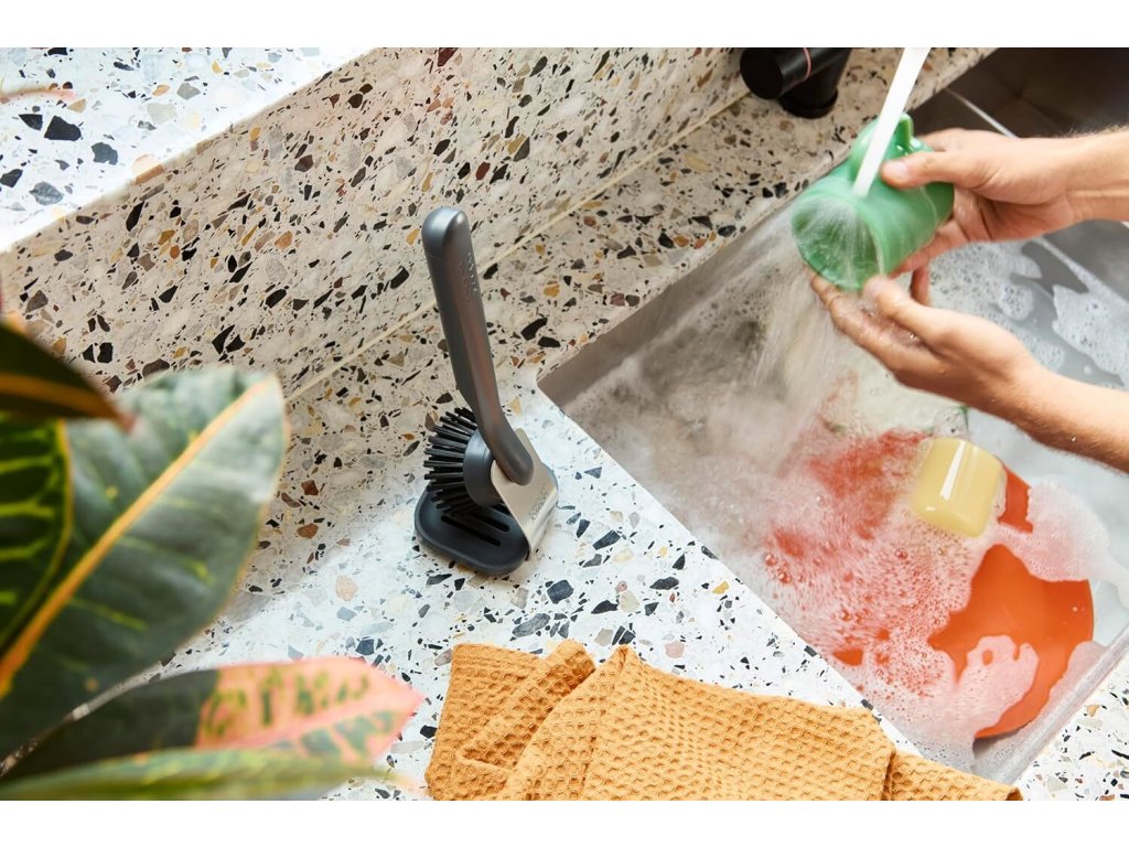 Kefka na riad SinkTech s odolnými štetinami na efektívne čistenie je vybavená integrovanou škrabkou, vďaka ktorej ľahko vyčistíte akýkoľvek riad. Súčasťou je stojan z nehrdzavejúcej ocele s odkvapkávacou miskou pre jednoduché skladovanie a rýchle schnutie.