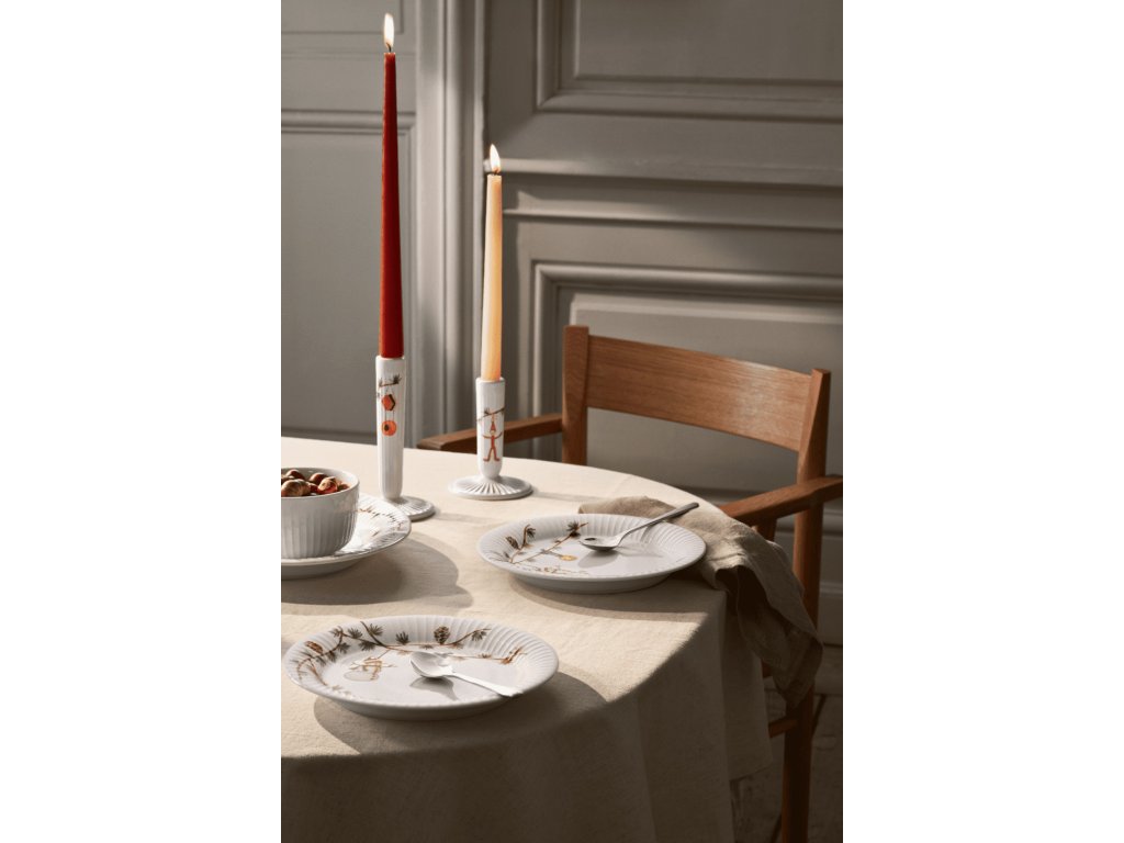 Svietniky z kolekcie Hammershøi Christmas majú štíhlu siluetu, ktorá vytvára harmonický vzhľad. Vďaka charakteristickým drážkam Hammershøi s vianočnými motívmi ladia so zvyškom tejto kolekcie. Sú ozdobené nostalgickými vianočnými prvkami, pričom zelená vetvička smrekovca vytvára jednotný dizajnový celok. Farebné motívy sú nakreslené modernou líniou a vyvolávajú nostalgické spomienky na Vianoce. V kolekciách Hammershøi Christmas a Hammershøi nájdete všetko od svietnikov a váz až po taniere a misky, aby ste mohli prestieť krásny stôl, na ktorom svietniky vytvoria útulnú atmosféru. Okrem toho máte možnosť vytvoriť si vlastné zátišie s rôznymi svietnikmi a vázou plnou kvetov.