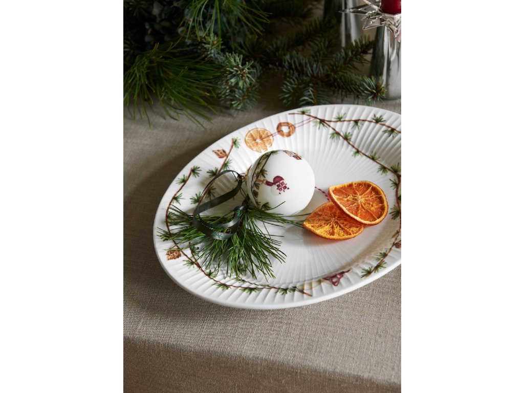 Hammershøi Christmas víta Vianoce sériou jedinečných ilustrácií na obľúbenom vianočnom riade. Jemné, detailné vianočné motívy sú dielom umelkyne Rikke Jacobsen. Vo svojom charakteristickom štýle rozpráva malé príbehy, v ktorých sa objavujú napríklad cukrové kornúty, anjeli, vlašské orechy, vtáky, šišky alebo hviezdy. Tento krásny servírovací tanier môžete použiť pri všetkých vianočných oslavách spolu s ladiacimi taniermi z rovnakej kolekcie Hammershøi Christmas alebo v kombinácii s klasickými bielymi taniermi Hammershøi. Oválny tanier je k dispozícii aj vo väčšej verzii 34 x 27 cm.
