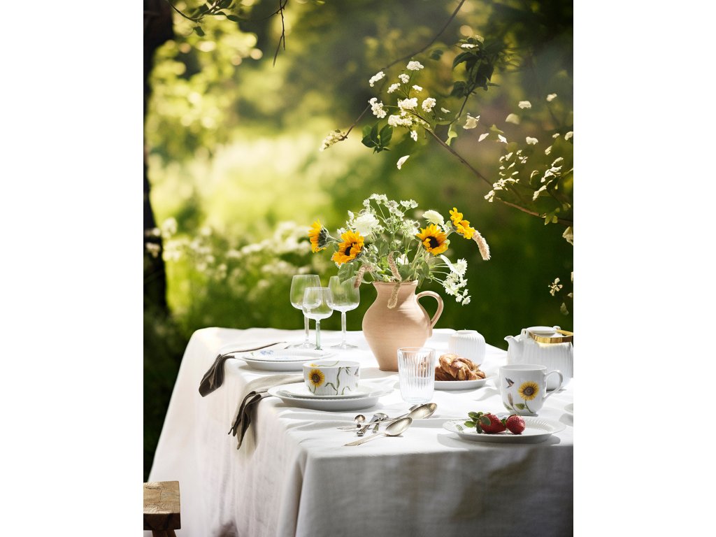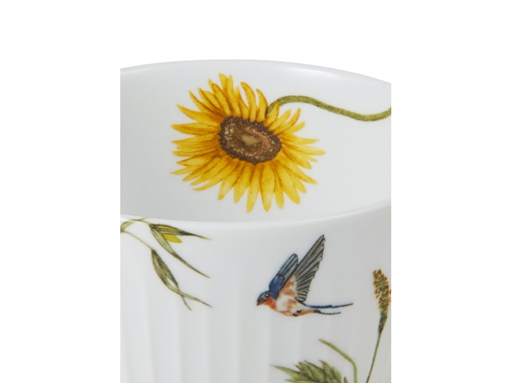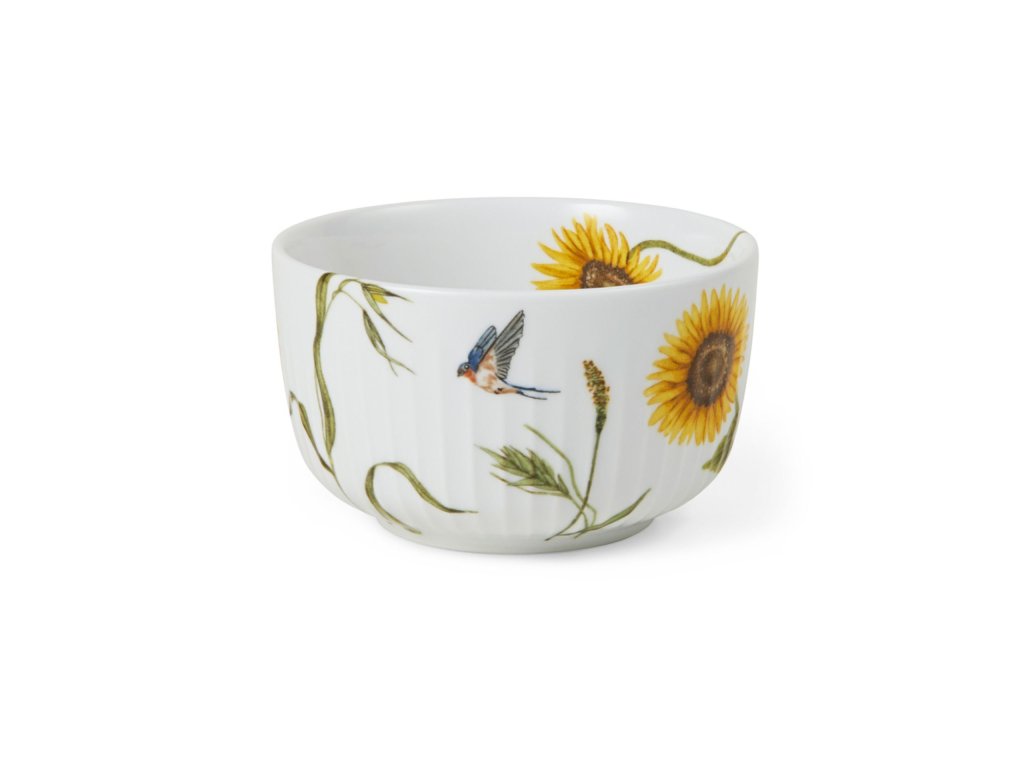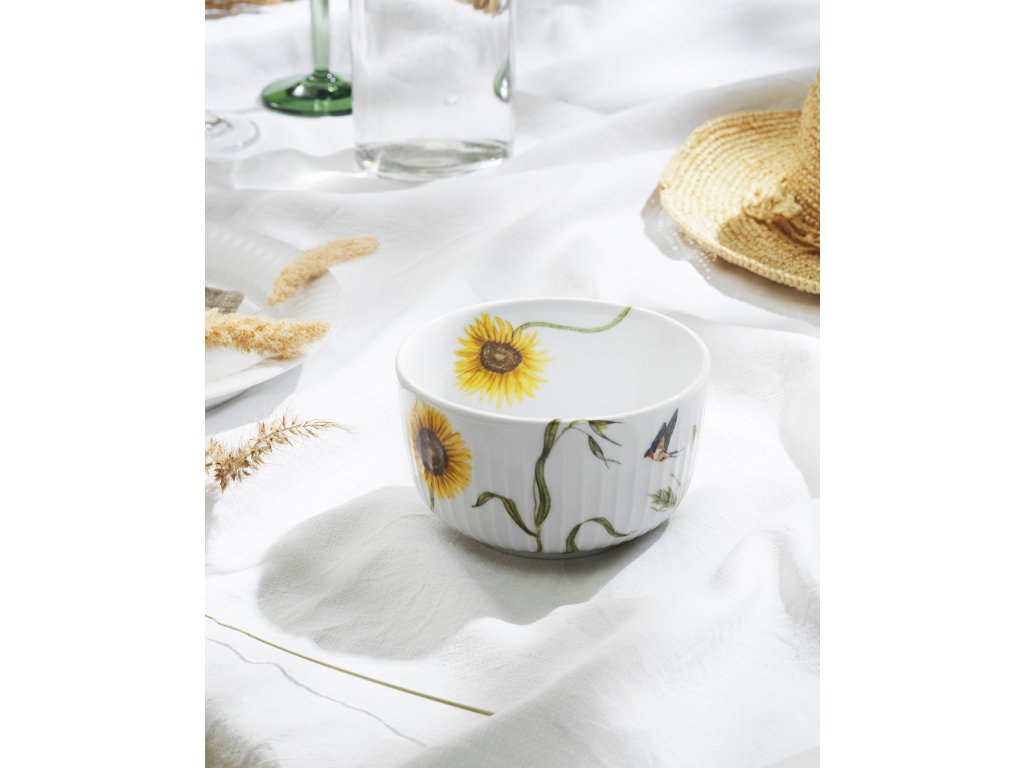 Porcelánovú misu s priemerom 12 cm je ideálna na servírovanie lesných plodov, sušienok alebo iných dobrôt vašim hosťom. Zdobí ju vysoký slnečnica a lastovička v lete. Slnečnica je po celom obvode misky zvečniťená rôznymi spôsobmi, čo vám umožní vnímať pohyb, ktorým počas dňa prechádza: otvorený kvet stojí od skorého rána smerom k slnku a počas dňa sa otáča, aby zachytil čo najviac slnečných lúčov. Na konci dňa sa slnečnica otočí smerom k západu. V noci sa potom opäť obráti k východu a trpezlivo čaká na návrat prvých slnečných lúčov. Autorkou akvarelových ilustrácií je umelkyňa Rikke Jacobsen, ktorá sa pri tvorbe inšpirovala čarovnými tvarmi, farbami a atmosférou dánskeho leta.
