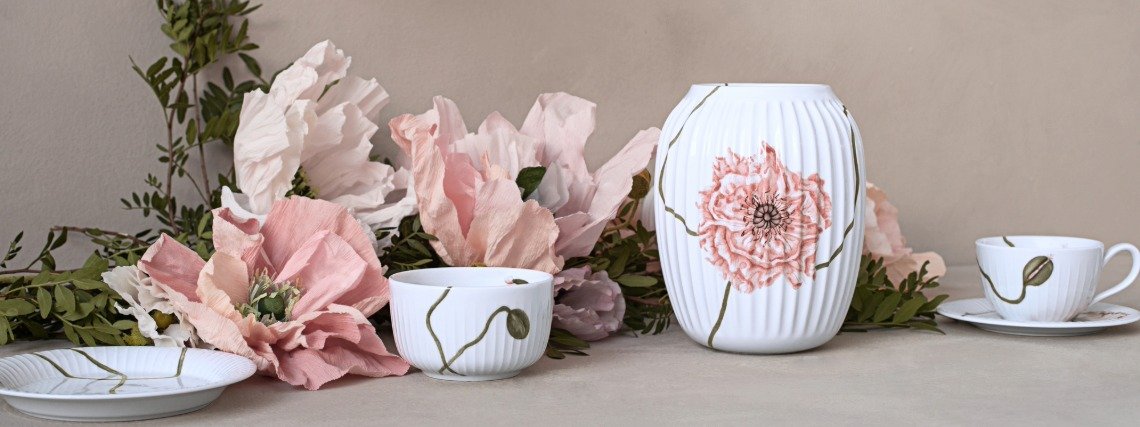 Motívy kolekcie Hammershøi Poppy vytvorila umelkyňa Rikke Jacobsen, ktorá pracovala s krásou maku a aktívne využila všetko od stonky, cez prvé púpätá až po plne rozkvitnutý kvet. S fantastickými detailmi sa maky ovíjajú okolo bieleho servírovacieho nádobia Hammershøi a vytvárajú krásny kontrast k jednoduchému dizajnu porcelánu. Hammershøi Poppy však nevyžaruje len krásu, ale aj kvalitu a remeselné spracovanie. 'Plátnom' pre svetloružové maky je klasický porcelán Hammershøi navrhnutý Hansem-Christianom Bauerom – táto kombinácia vám teda dáva nespočetné možnosti. Môžete sa pohrať so spôsobom umiestnenia tanierov, mís a šálok – podľa toho, ako ich budete otáčať, môžete vytvoriť veľmi odlišné vzhľady a štýly. Jedálny stôl môžete premeniť na pôvabné kvetinové pole alebo môžete kolekciu Poppy skombinovať s klasickým bielym servisom Hammershøi pre dosiahnutie decentnejšieho vzhľadu.