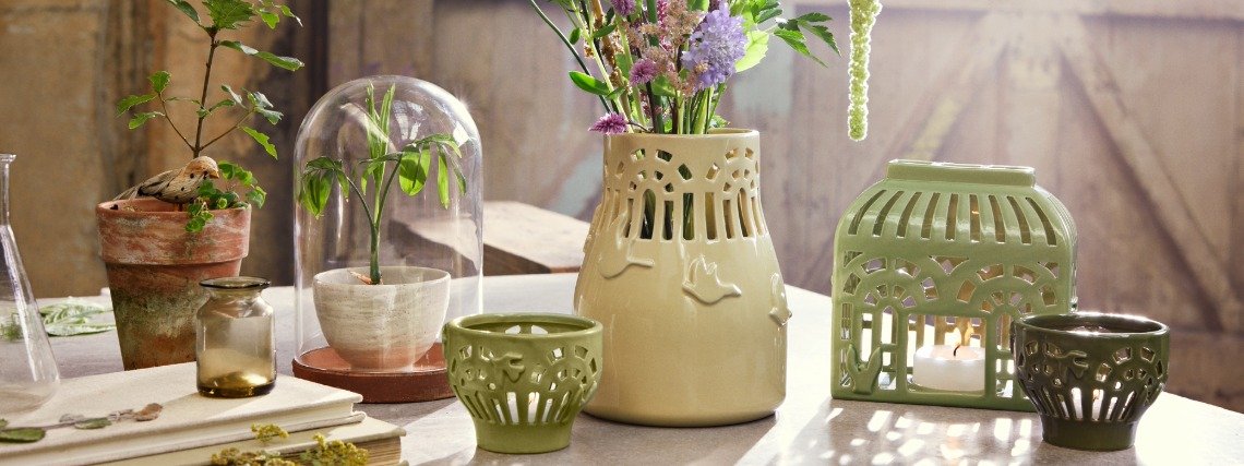 Inšpiráciou architektúrou, jedinečnou atmosférou a štruktúrou slnkom presvetlenej oranžérie vytvorila značka Kähler kolekciu Orangery, ktorá zahŕňa keramickú lucernu, vázu a dva svietniky na čajové sviečky. Všetko je vyrobené z glazovanej keramiky s najjemnejšími detailmi, vďaka ktorým je každý dizajn celkom jedinečný.