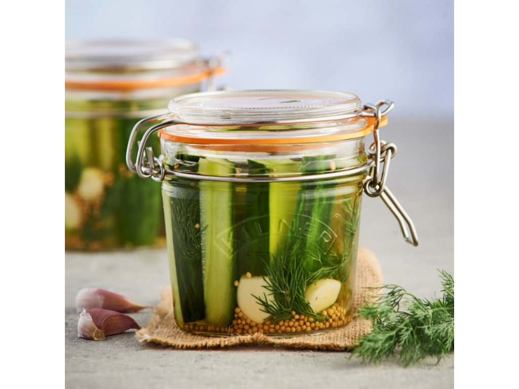 Okrúhla nádoba Kilner s klipom z nehrdzavejúcej ocele a skleneným viečkomm oranžové gumové tesnenie, ideálne na konzervovanie džemov, marmelád, citrónovsirup a na skladovanie suchých potravín, ako sú semienka a orechy, ale predovšetkým bude skvelým pomocníkom pri konzervovaní rôzneho ovocia a zeleniny, čatní, pesta alebo paštét. So zaváraninovými pohármi Kilner môžete vyrobiť originálne darčeky pre svoju rodinu a priateľov, ktoré potešia každého.