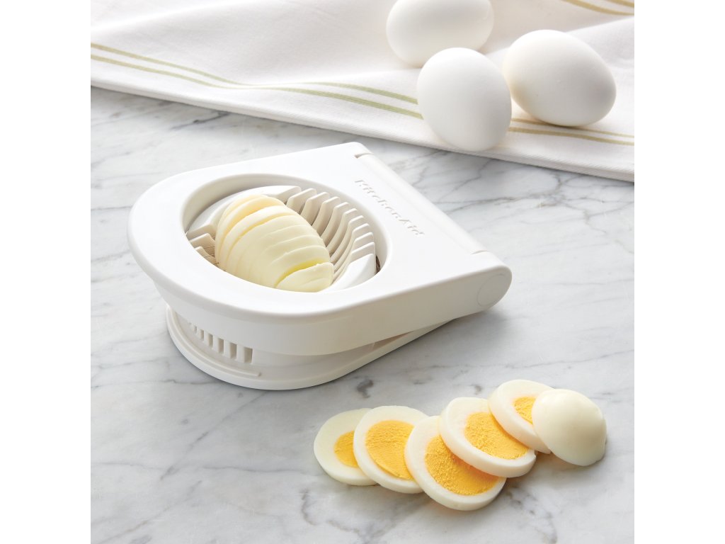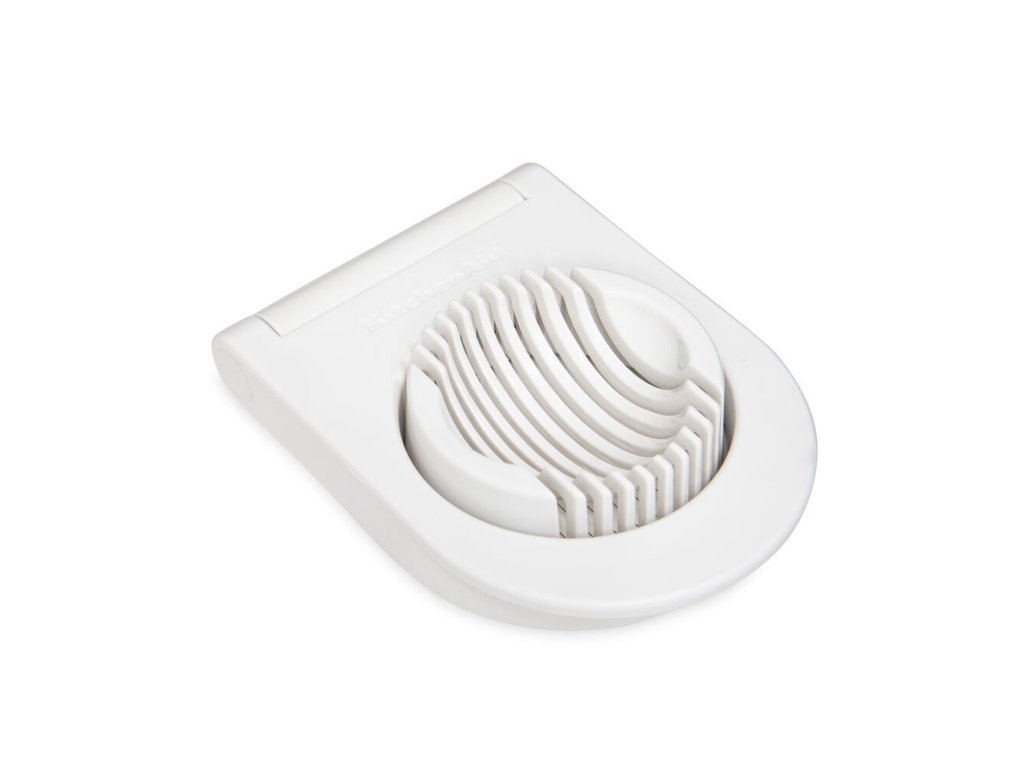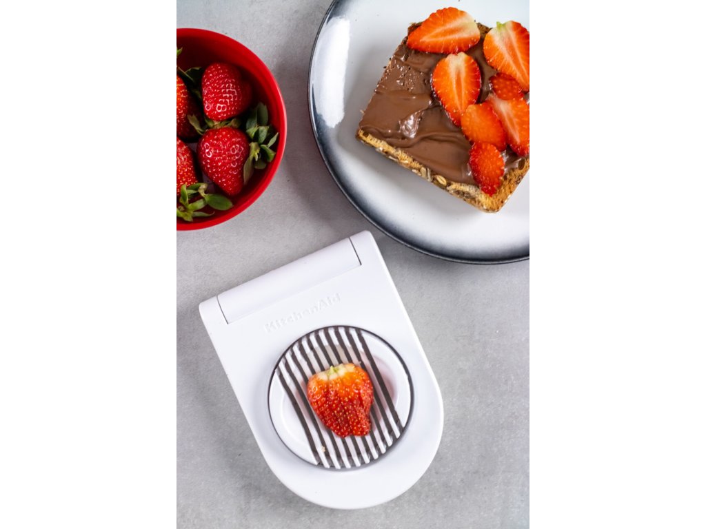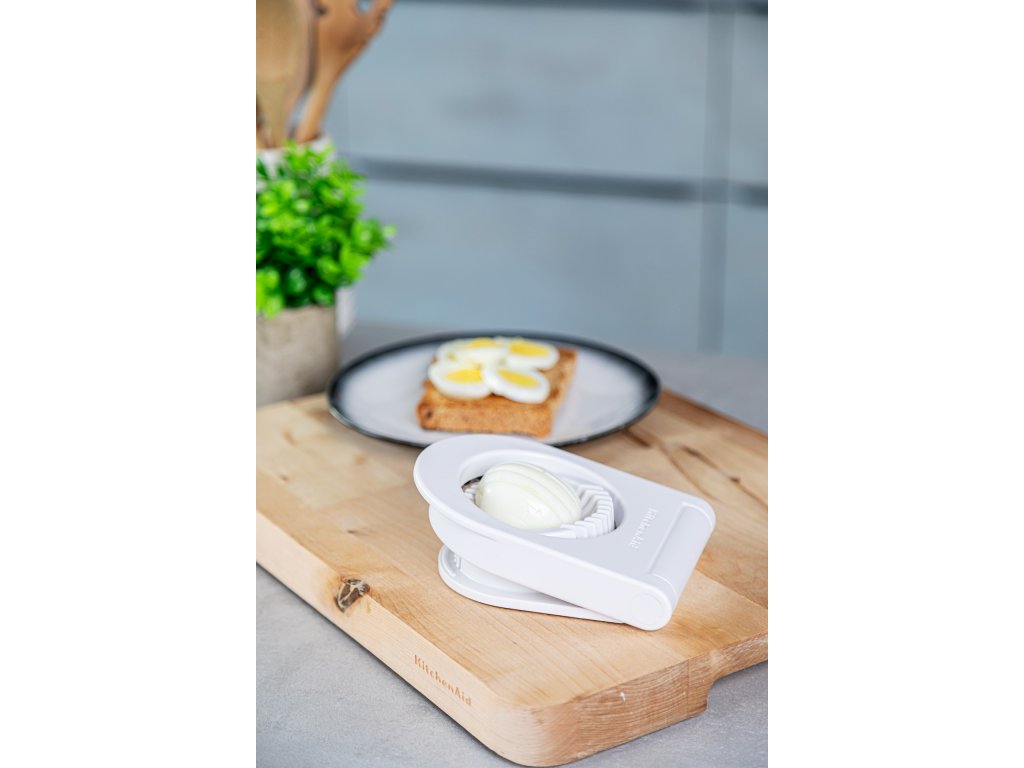 Krájač na vajcia KitchenAid je ideálny na prípravu tenkých, rovnomerných plátkov vajec uvarených natvrdo, húb, mäkkých syrov a ďalších. Jeho používanie je jednoduché; jednoducho vložte potraviny do lôžka a jemne zatlačte hornú časť nadol. Vďaka protišmykovej základni zostane krájač počas používania na svojom mieste. Tento spoľahlivý a nepostrádateľný kuchynský pomocník je vybavený strunami z nehrdzavejúcej ocele, ktoré zakaždým zabezpečia čistý rez a nikdy ich netreba ostriť.