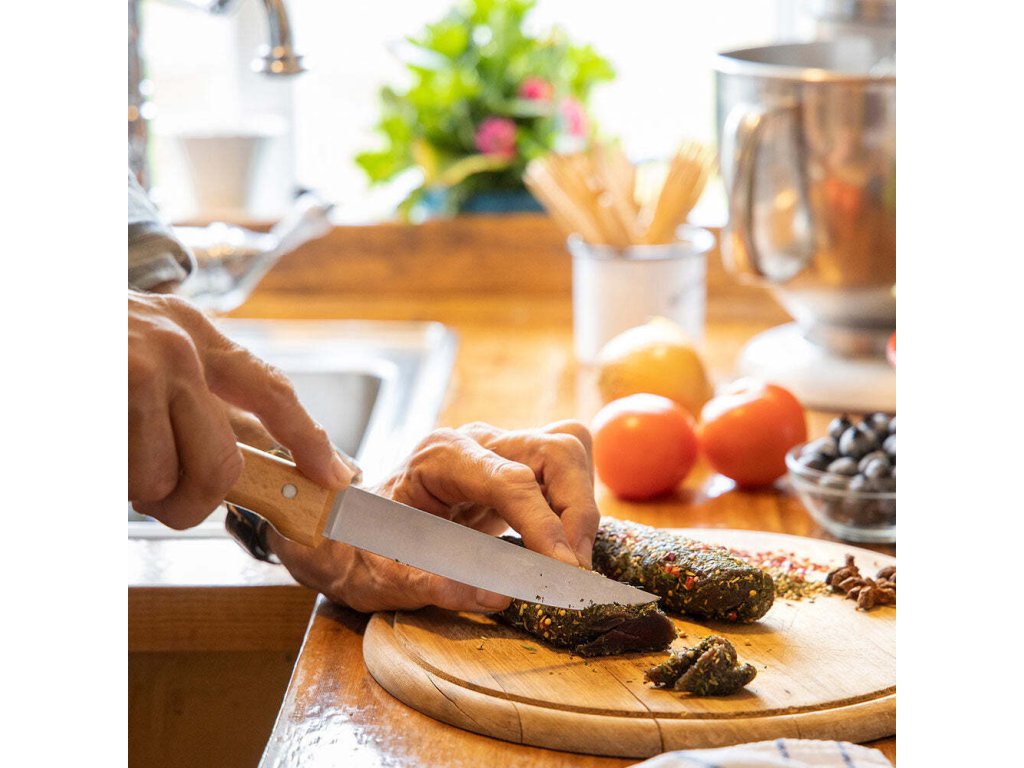 Nôž Opinel na krájanie s rukoväťou z lakovaného bukového dreva uľahčuje krájanie hydinovej pečienky, ako aj častí jahňacieho mäsa alebo hydiny.