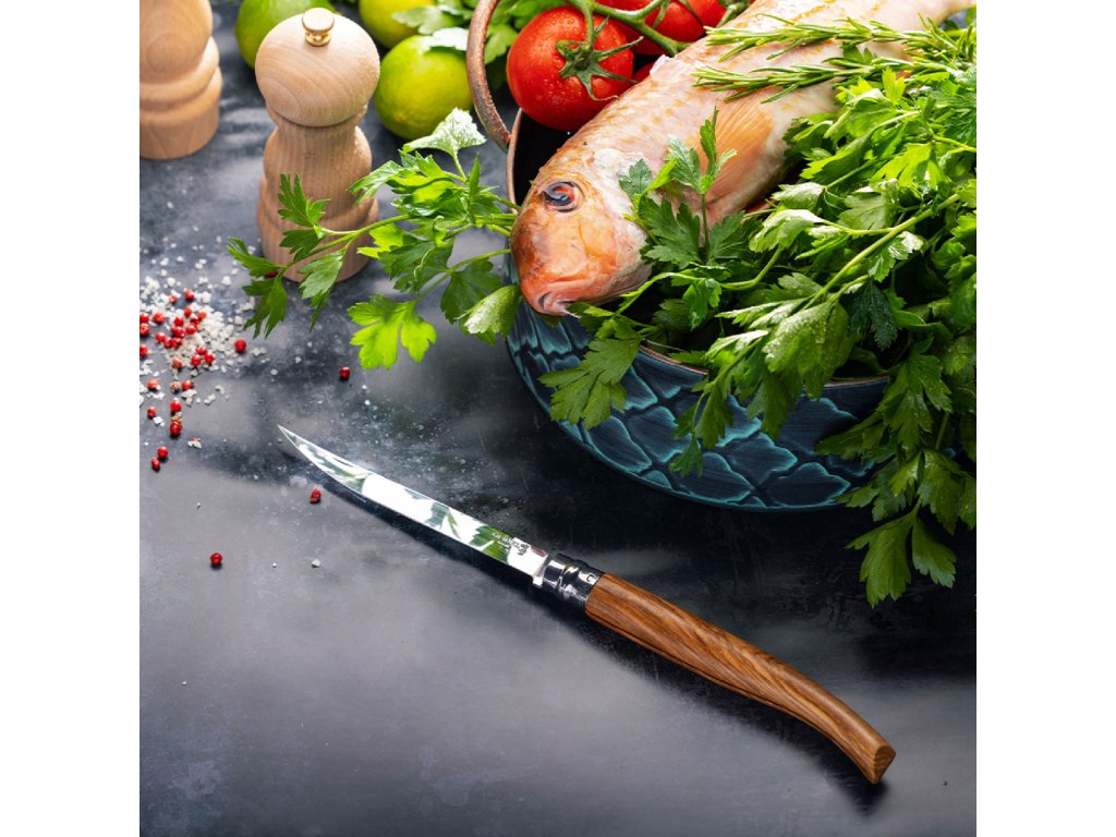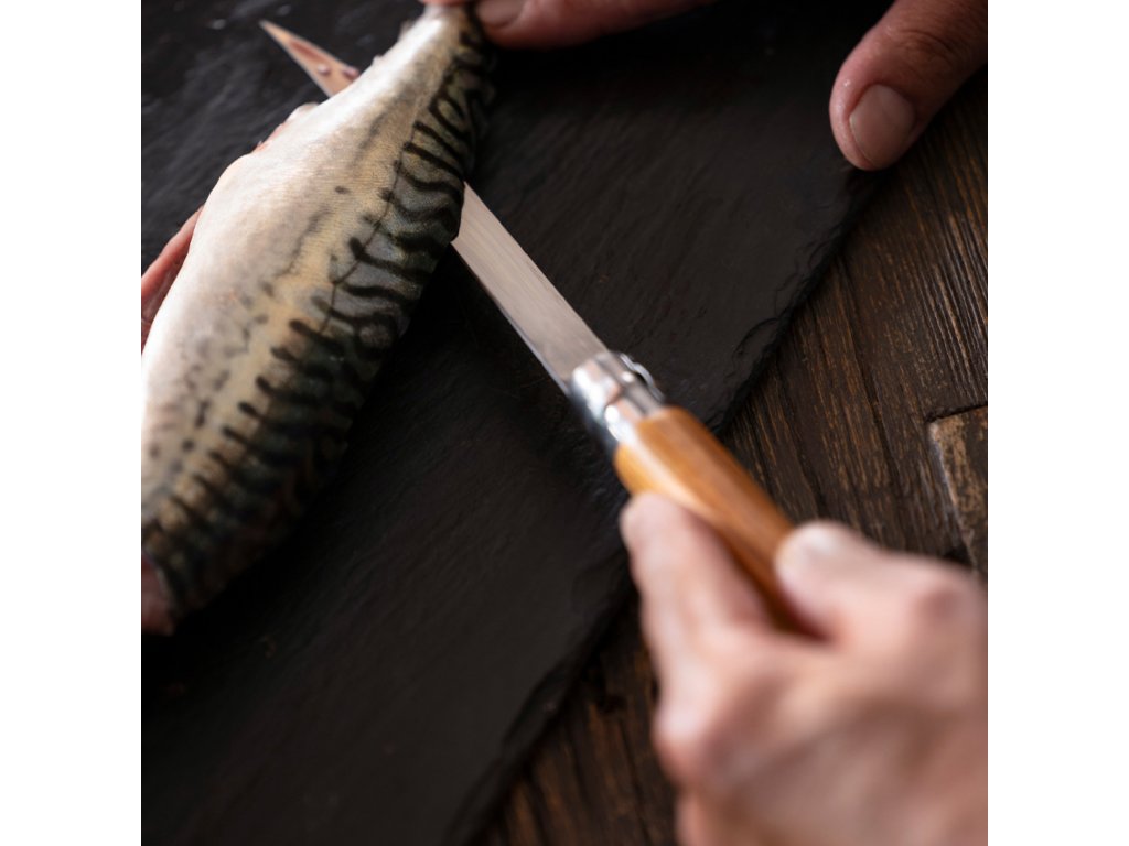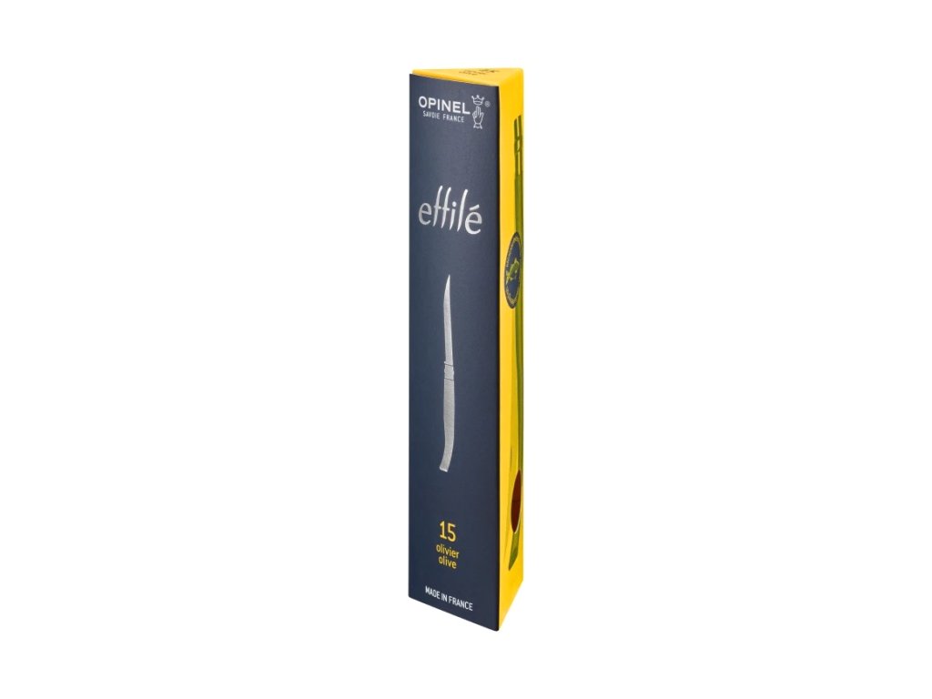 Nová verzia nožov Opinel prináša do kolekcie nový nôž: Effilé N°15 Olive! S elegantnou rukoväťou z olivového dreva, bezpečnostným krúžkom ViroBloc na zaistenie čepele v otvorenej aj zatvorenej polohe a 15 cm čepeľou so zrkadlovo lešteným povrchom z nehrdzavejúcej ocele. Ideálny nôž na filetovanie rýb vďaka pružnej, jemnej a ostrej čepeli. Vyrobené vo Francúzsku.