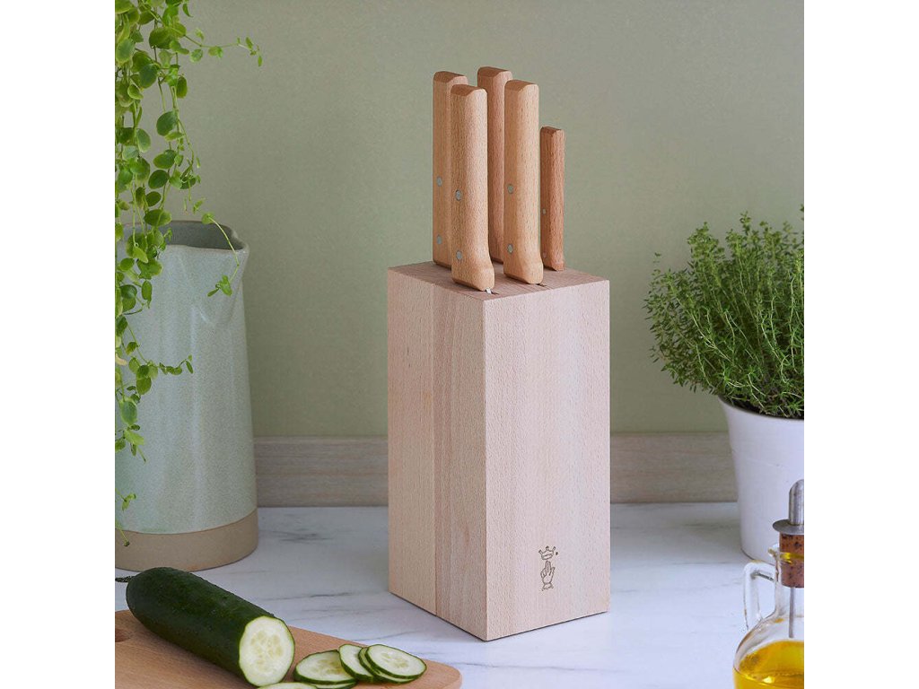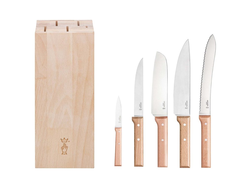 Sada 5 nožov Opinel Parallèle v odolnom kuchynskom bloku z bukového dreva. Sada obsahuje kuchársky nôž, nôž santoku, nôž na vykosťovanie, nôž na krájanie a nôž na špíz.
