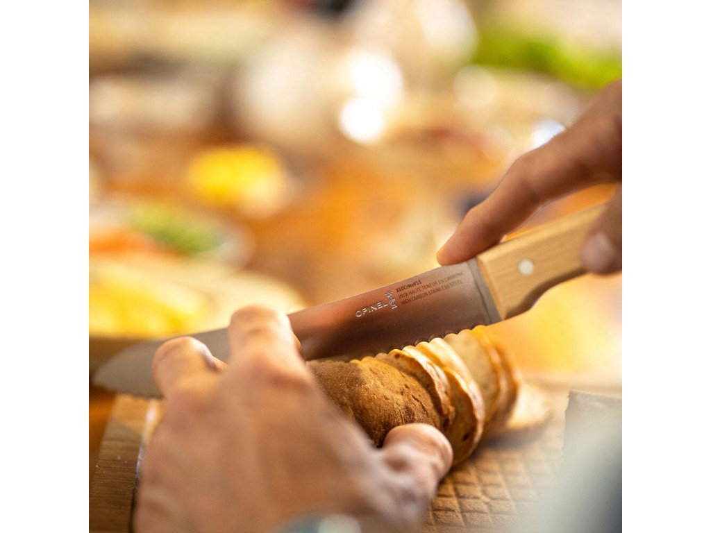 Zúbkovaný príborový nôž Opinel Parallèle s bukovou rukoväťou, ktorý oceníte pri krájaní pečiva. Dĺžka čepele 21 cm.