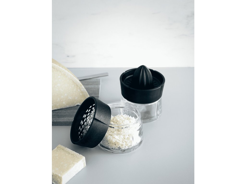 Strúhadlo Grand Cru s čiernym uzáverom a integrovaným strúhacím kotúčom z nehrdzavejúcej ocele je samo o sebe malým umeleckým dielom. Praktické a funkčné, so skleneným zásobníkom, do ktorého môžete nastrúhať napríklad parmezán, ktorý je potom pripravený na servírovanie alebo na uskladnenie v chladničke.