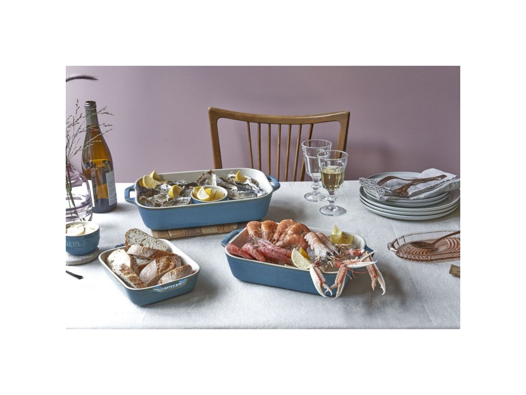 Veľký obdĺžnikový pekáč od francúzskej značky Emile Henry bol vyrobený z odolnej keramiky High Resistance s rozmermi 42,5 x 28 cm a objemom 4 l.