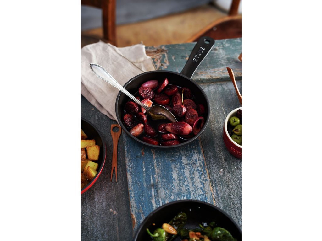 Vychutnajte si večer ako v španielskom tapas bare, kedykoľvek budete chcieť, a zažite pravú dovolenkovú atmosféru u vás doma! Tieto malé okrúhle panvice sú ideálne na prípravu a podávanie rôznych pokrmov. Liatinová panvica je veľmi odolná a rovnomerne rozvádza teplo. Použite ju na rýchle opečenie mäsa alebo morských plodov, napríklad vyprážaných kreviet s chilli a citrónom, alebo zeleniny, napríklad cukety a papriky. Vďaka čiernemu matnému smaltovanému povrchu môžete použiť menej oleja a tortilla sa na panvicu neprilepí.