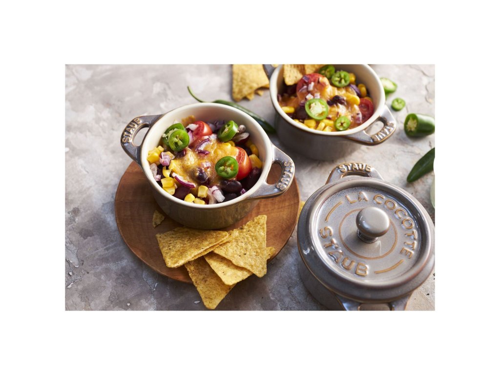 Sada 4 keramických foriem Mini Cocotte od Staub svojím tvarom a názvom odkazuje na svoje väčšie liatinové súrodencov. Na rozdiel od nich vyrobené z odolnej glazovanej keramiky v výrazných farbách vychádzajúcich z tradičných farieb slávneho liatinového riadu Staub. Sú perfektné na prípravu jednotlivých porcií predjedál, dezertov aj príloh v rúre a následné servírovanie priamo na stôl.
