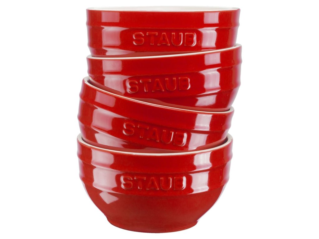 Sada 4 misiek Staub vyrobených z odolnej glazovanej keramiky vo výrazných farbách vychádzajúcich z tradičných farieb slávneho liatinového riadu Staub.