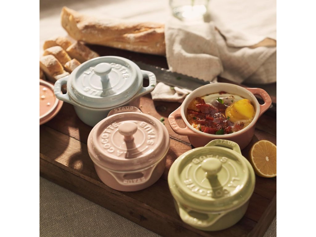 Sada 6 keramických foriem Mini Cocotte od Staub svojím tvarom a názvom odkazuje na svojich väčších liatinových súrodencov. Na rozdiel od nich vyrobené z odolnej glazovanej keramiky vo svetlejších a tmavších odtieňoch ružovej, modrej a zelenej farby. Sú perfektné na prípravu jednotlivých porcií predjedál, dezertov aj príloh v rúre a následné servírovanie priamo na stôl.
